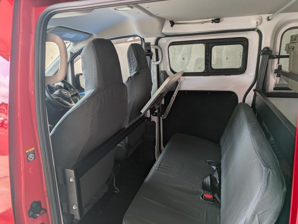 後部座席に折り畳み式テーブルを備え、出場中の情報収集を可能にしています。
